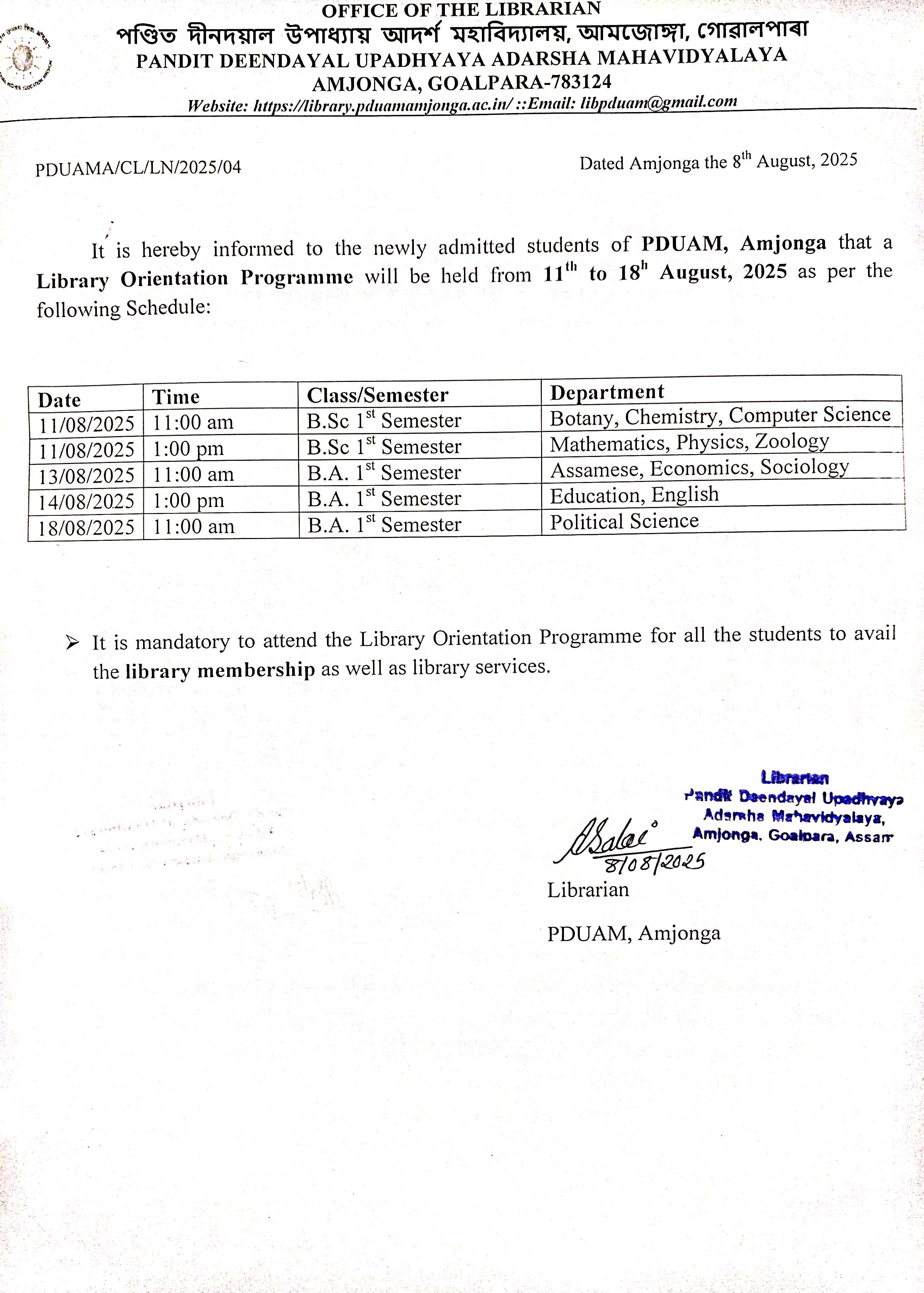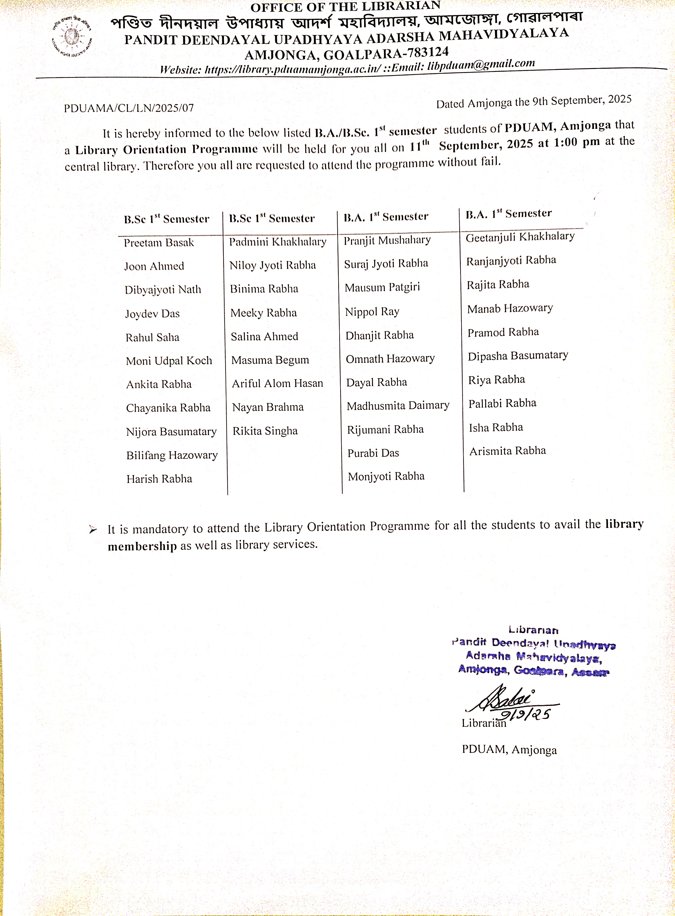 • Notice for B.A/B.Sc. 1st Semester Library Orentation Programme on 11-09-2025Click Here