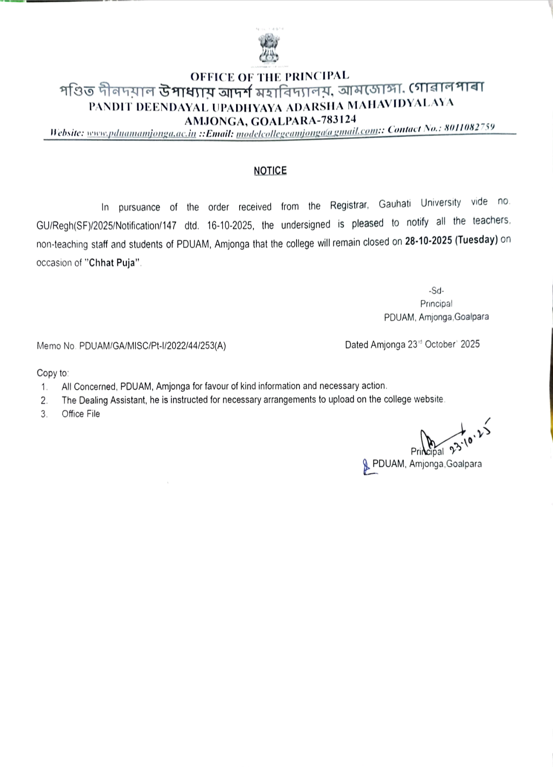 • Notification For the Teaching & Non-Teaching Staff, PDUAm,AmjongaClick Here
