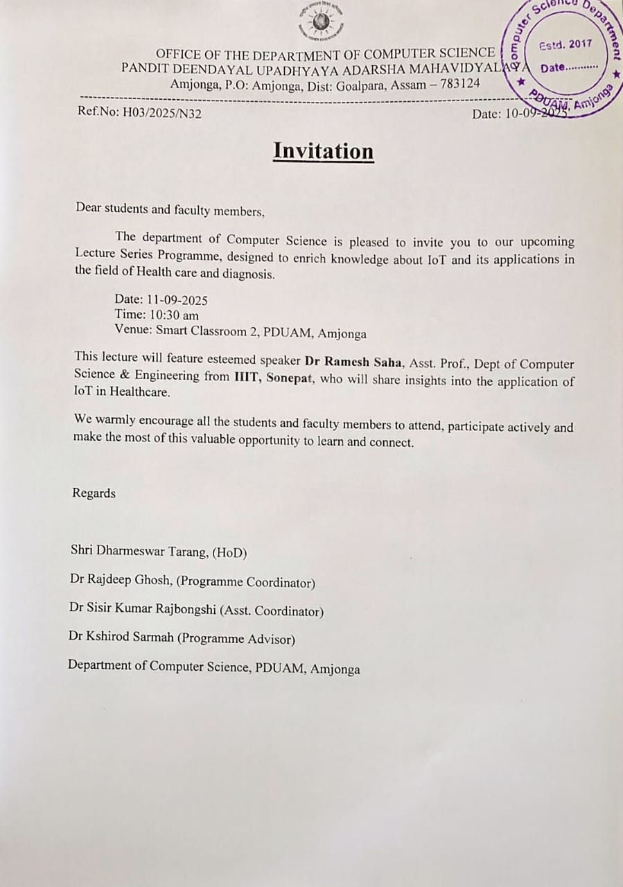 • Notice for Lecture Series on IoT in Helthcare organised by Department of Computer ScienceClick Here